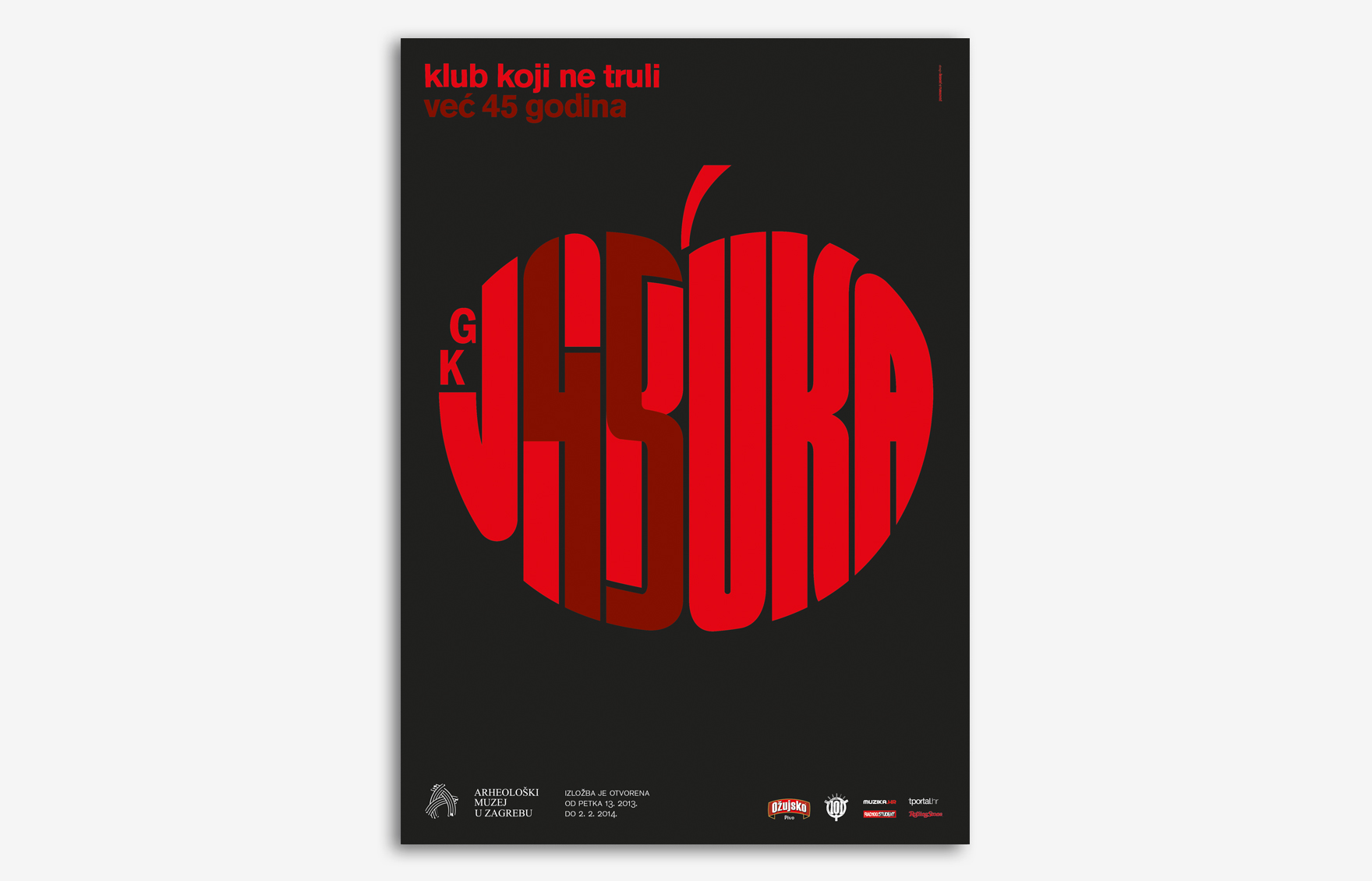 Izložba o 45 godina povijesti kluba Jabuka. Klub Jabuka povezuje mnoge generacije i svatko uz njega veže posebne emocije i doživljaje, a mi smo iskoristili činjenicu da se od njegovog otvorenja do danas nije puno promijenilo. Svaka soba u postavu prikazuje vremensko razdoblje te se u svakoj nalazi isti stilizirani šank kako bi se naglasilo da se ljudi mijenjaju, a Jabuka ostaje ista.